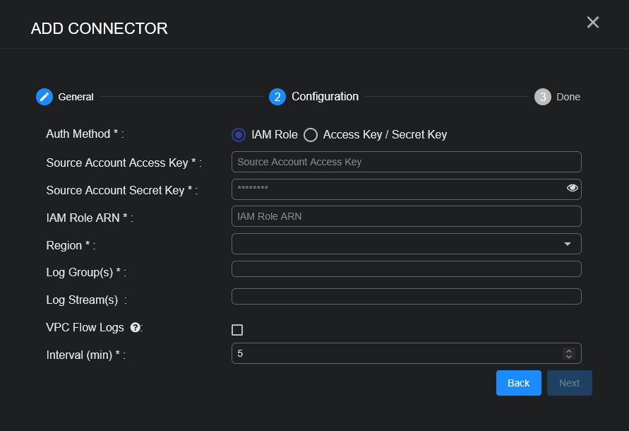 When configuring the connector in Stellar Cyber, you will need the destination AWS account (MSSP's tenant account), the IAM role ARN, as well as the CloudWatch log group name.