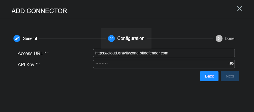 Enter the Access URL you noted above in Configuring Bitdefender API Access (for example: https://cloud.gravityzone.bitdefender.com).