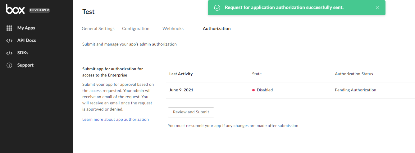 Navigate to the Authorization tab and click the Review and Submit button to send your request for application authorization to an Admin user.