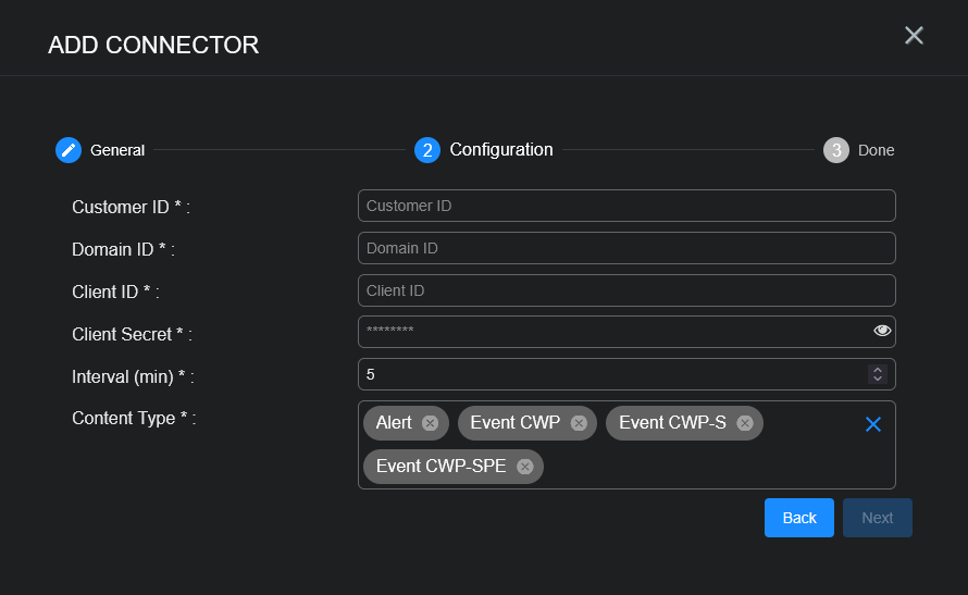 With the configuration information handy, you can add the Broadcom (Symantec) Cloud Workload Protection connector in Stellar Cyber: