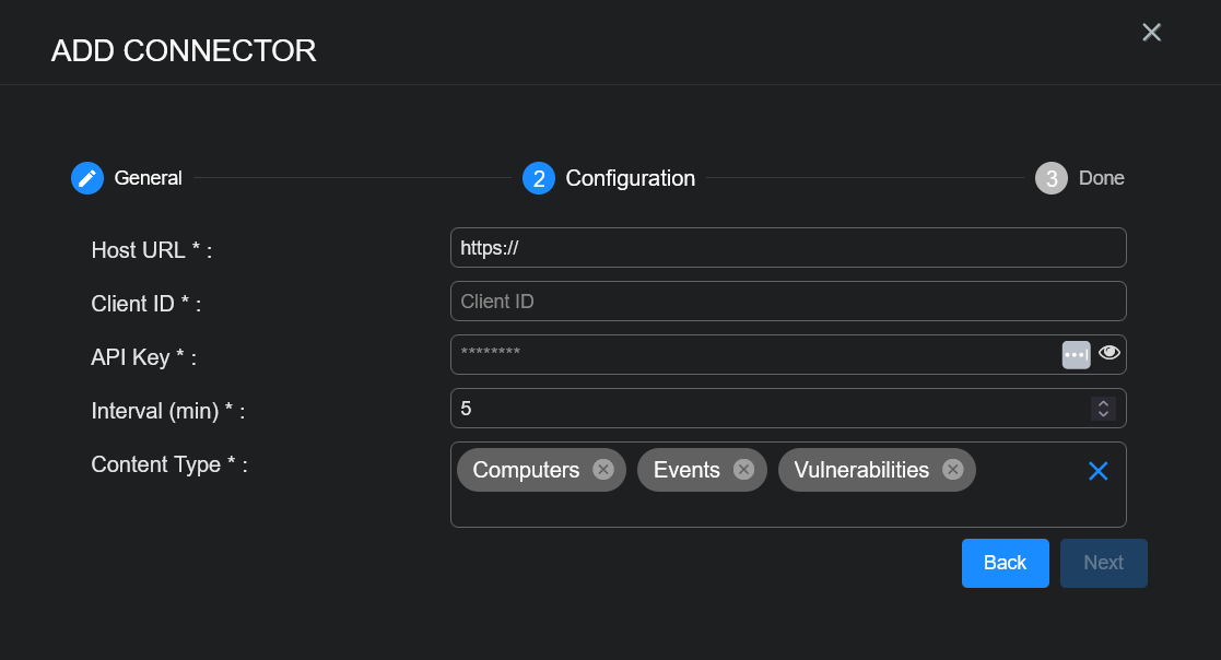 Choose the Content Type you would like to collect. The logs for Computers, Events, and Vulnerabilities are supported.