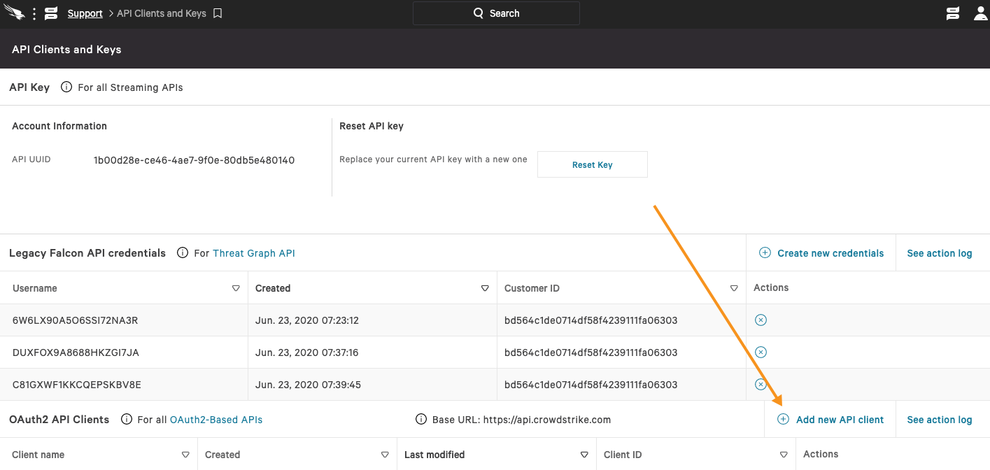 With streaming APIs enabled, you can generate the CrowdStrike Falcon API key: