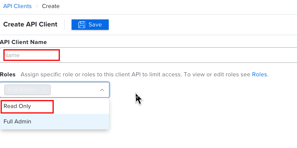 Add one or more Roles to configure permissions for the API client (Read Only is sufficient)