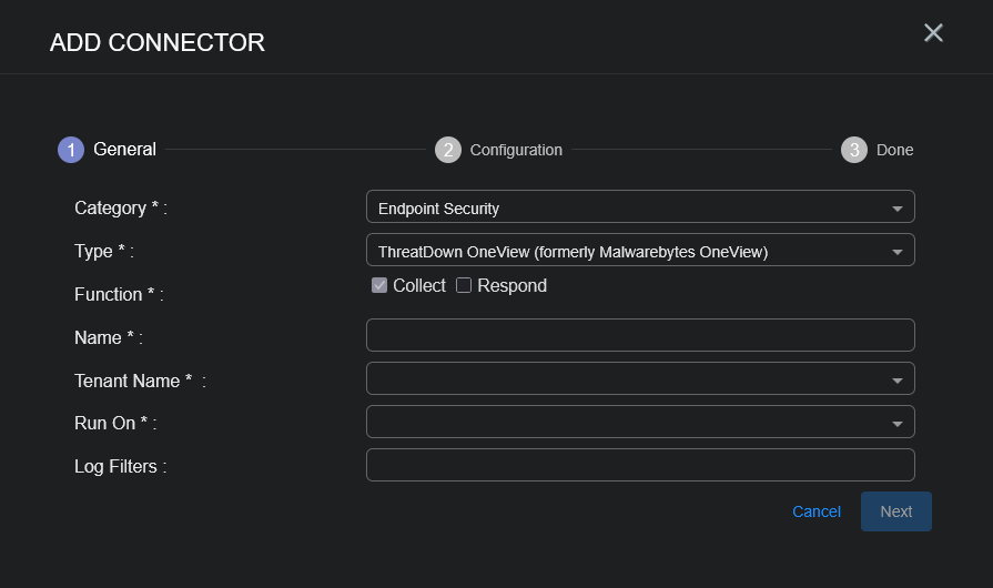 To add a ThreatDown OneView connector in Stellar Cyber: