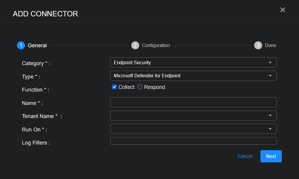 Microsoft Defender for Endpoint connectors allow Stellar Cyber to ingest logs or issue response actions with Microsoft Defender for Endpoint and add the records to the data lake. There can be any number of Microsoft Defender for Endpoint connectors active.