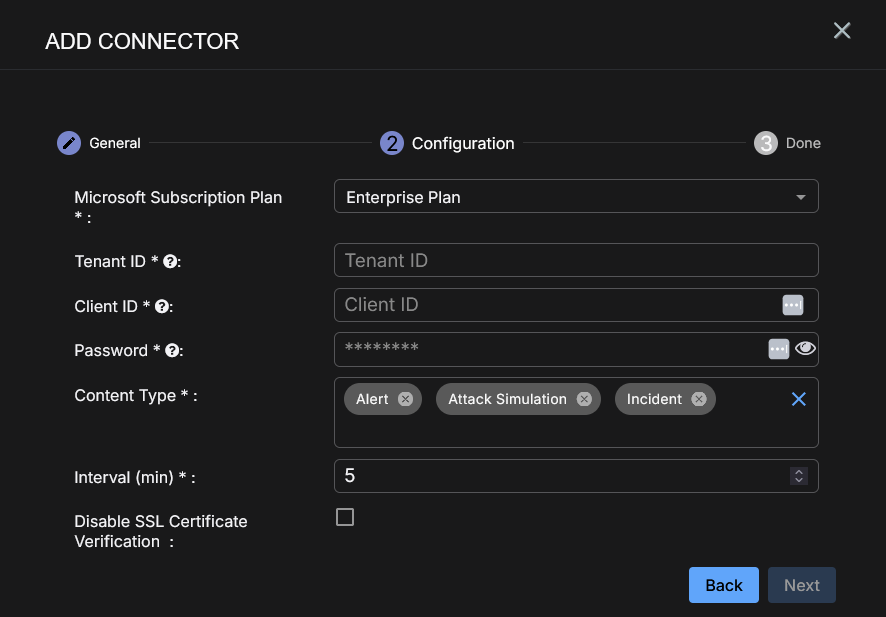 Choose the Content Type you would like to collect. The logs for Alert , Attack Simulation, and Incident are supported.