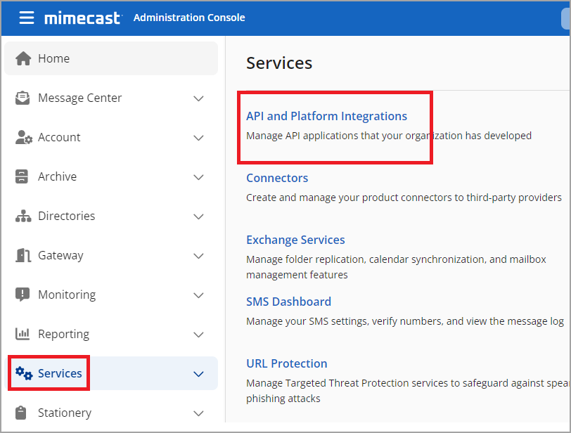Log in to the Mimecast Administration Console, click Services and select API and Platform Integrations.