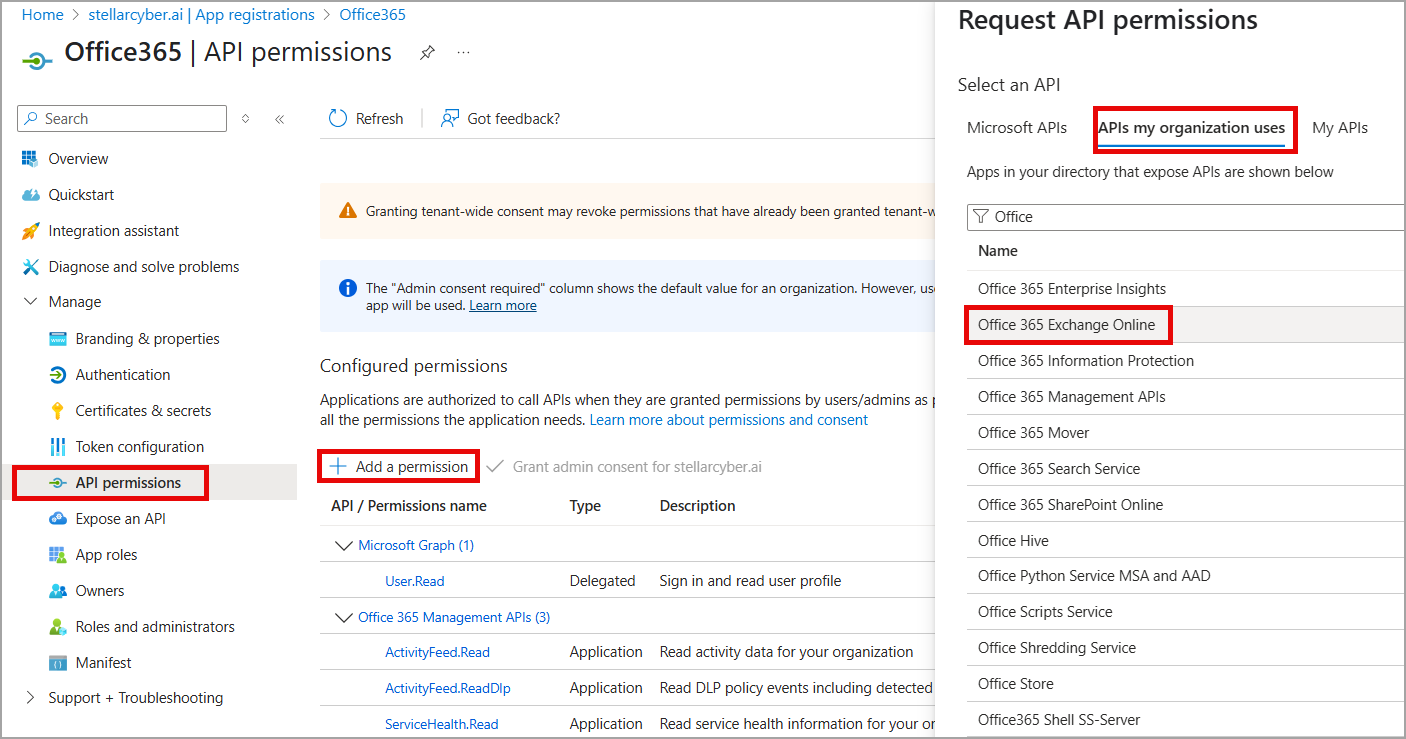 After adding permissions, there is a banner at the top of the API Permissions page that says the permissions require admin consent.