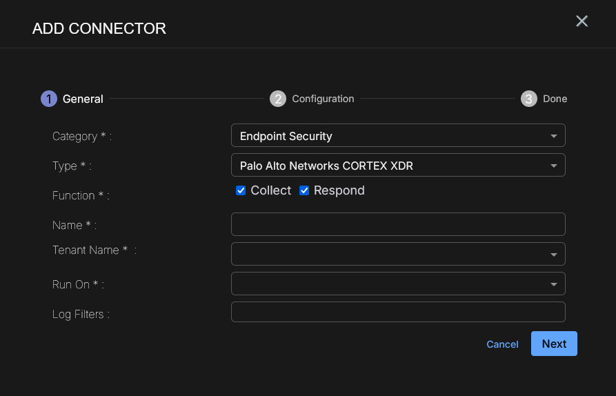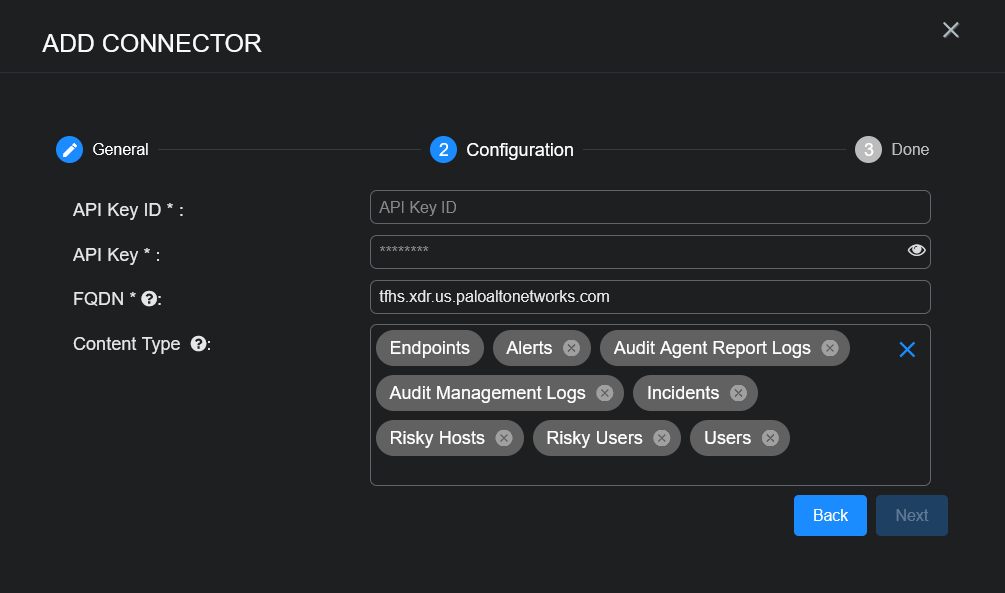 To add a Palo Alto Networks CORTEX XDR connector in Stellar Cyber: