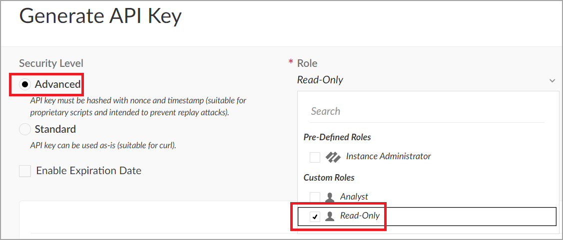 In the Generate API Key page, select either Standard or Advanced for the Security Level of the API key, then select the Role that gives you the appropriate access level for this key.