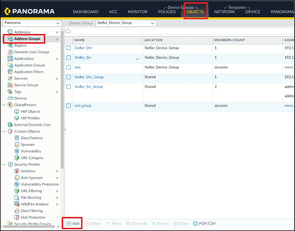 Check the Palo Alto firewall. In this example, the PA-VM firewall was added to Stellar_Device_Group.