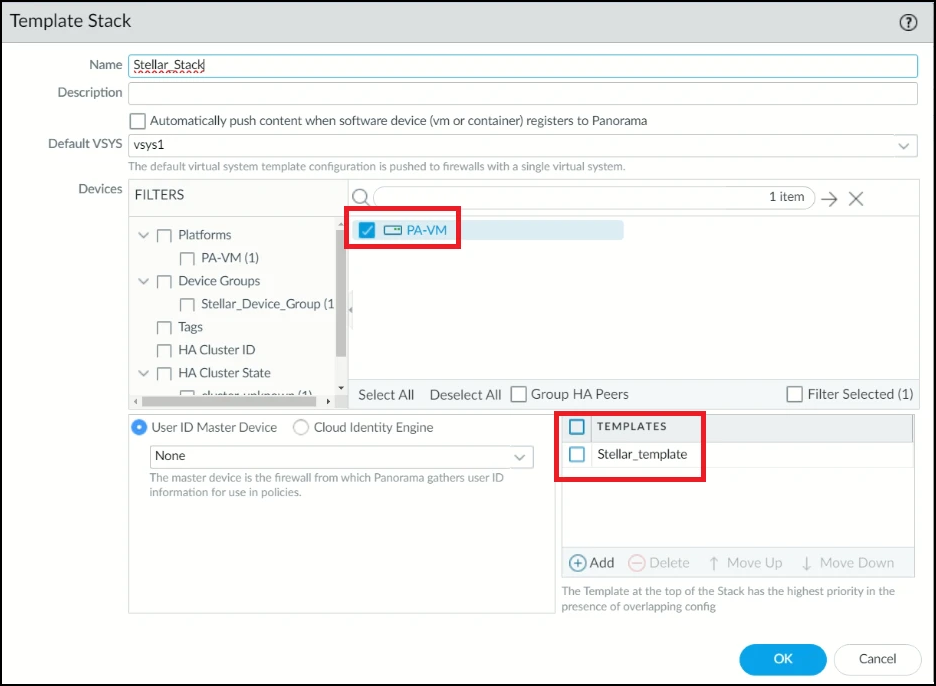 In the Template Stack screen, enter the Name of the template stack. In this example, it is Stellar_Stack.