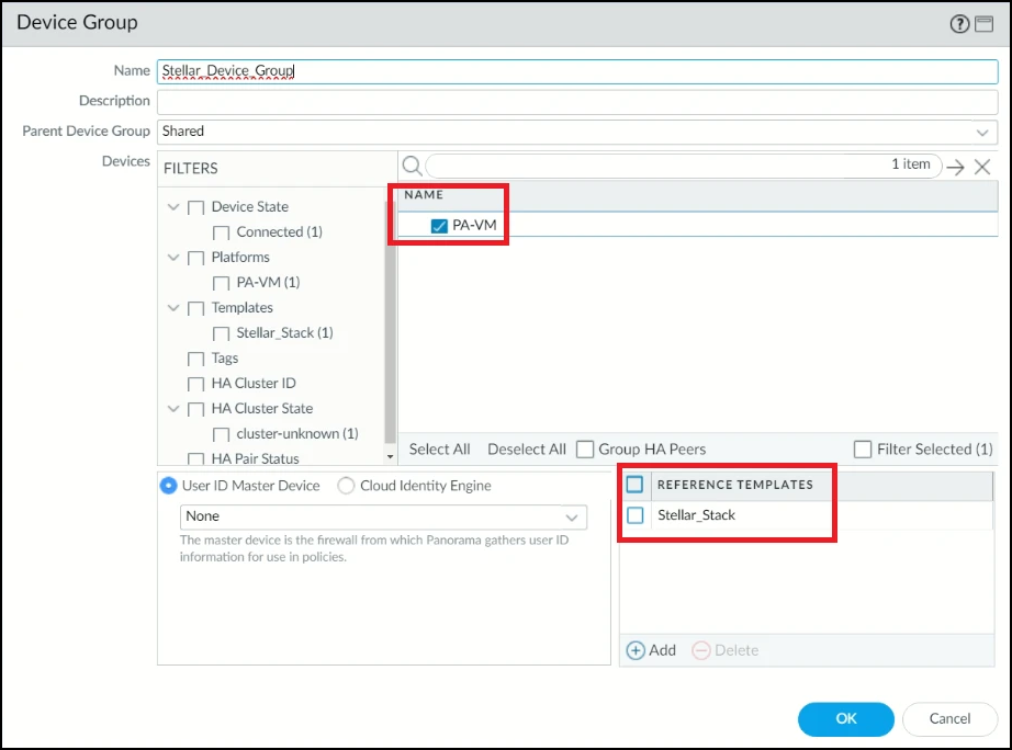 Under the Target tab, for the Device Group, select the firewall. In this example, the Device Group is Stellar_Device_Group and the firewall is PA-VM.