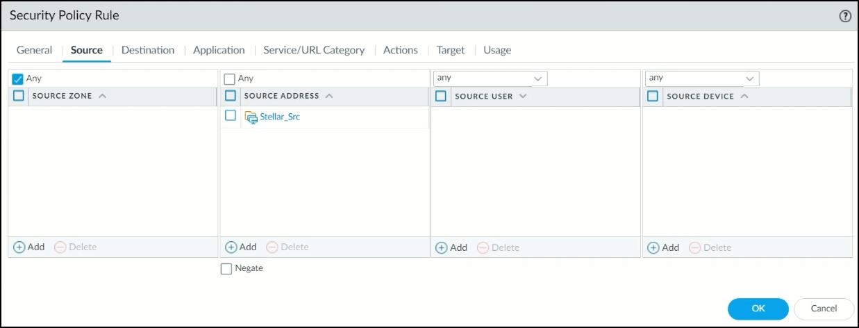 Under the Source tab, select Any and then add the source address group. In this example, it is Stellar_Src.