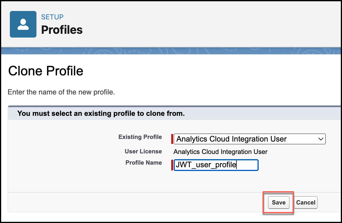 Select Analytics Cloud Integration User as an Existing Profile to clone from, enter a new Profile Name, and click Save.