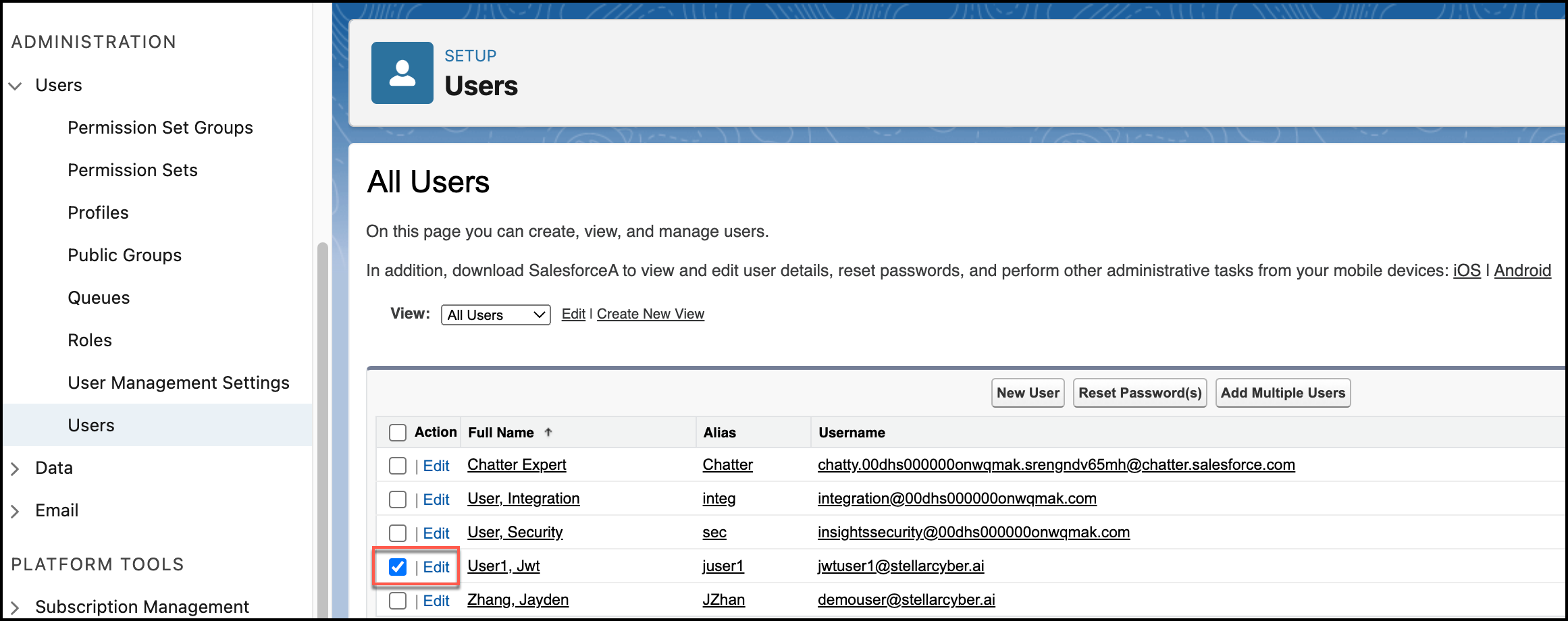Under ADMINISTRATION, navigate to Users | Users, click New User, and click Edit.