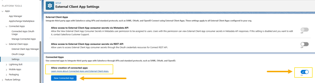Enable the Allow creation of connected apps option and click the New Connected App button.