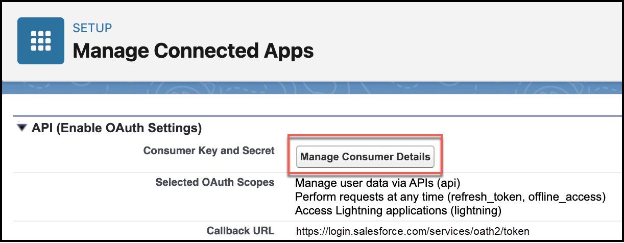 Under API (Enable OAuth Settings), for Consumer Key and Secret, click Manage Consumer Details.