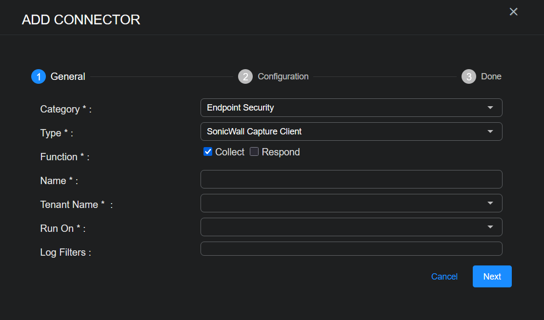 To add a SonicWall Capture Client connector in Stellar Cyber: