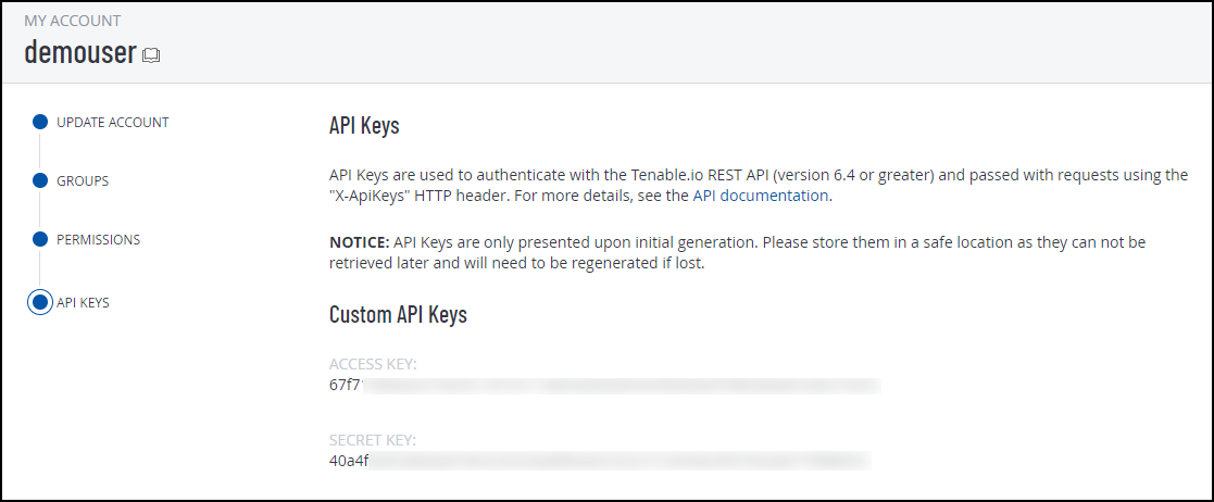 Store the API keys in a safe location. They cannot be retrieved later although they can be regenerated.