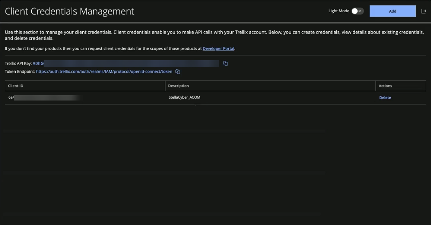 Copy the Client ID and Secret and store them in a safe location. Also copy the Trellix API Key. These credentials are used in the configuration of the Trellix MVISION connector.