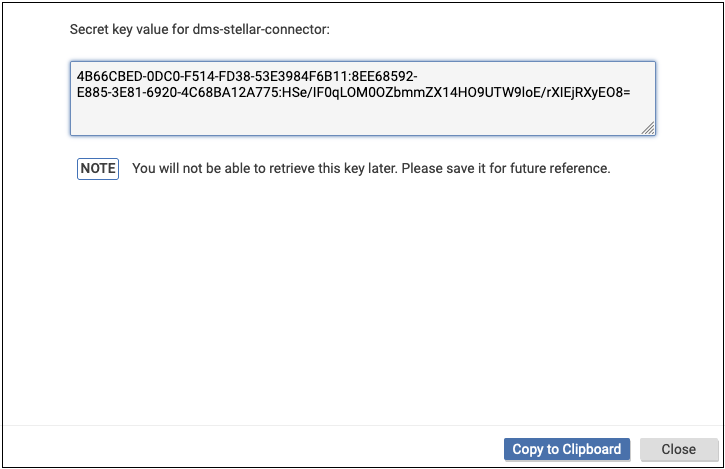 The dialog updates to display the secret key for your new app. Make note of this for use when you configure your connector. You cannot retrieve this key after you close the dialog, so make note of it now. If you accidentally lose the information, you must create a new app.