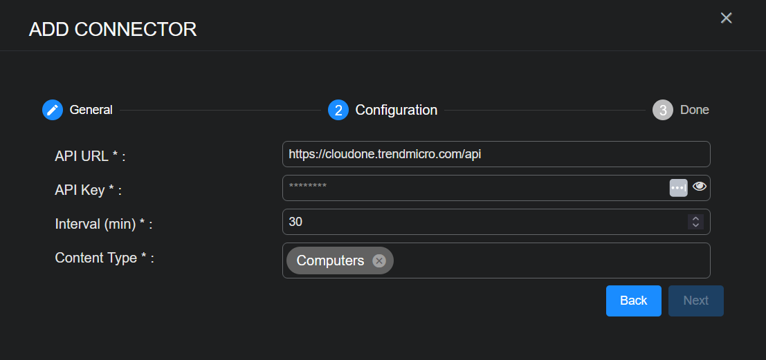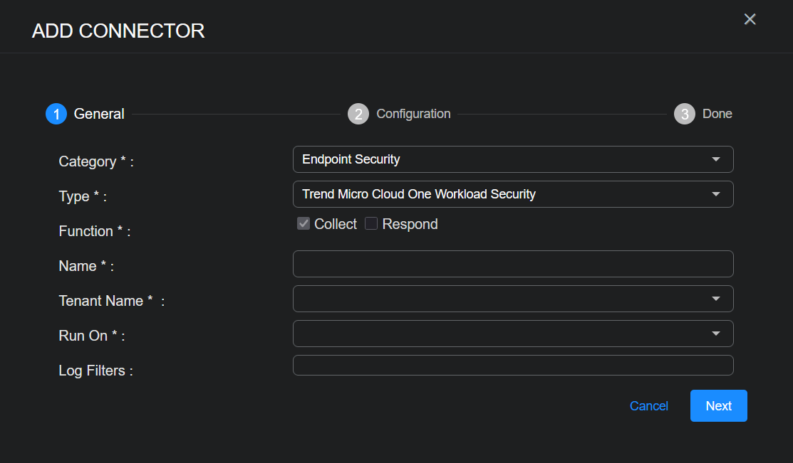 After you have noted the authentication information from the Trend Micro app integration steps, you can add the Trend Micro Cloud One Workload Security connector in Stellar Cyber: