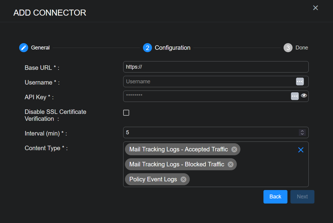 Choose the Content Type you would like to collect. The logs for Mail Tracking Logs - Accepted Traffic, Mail Tracking Logs - Blocked Traffic, and Policy Event Logs are supported.