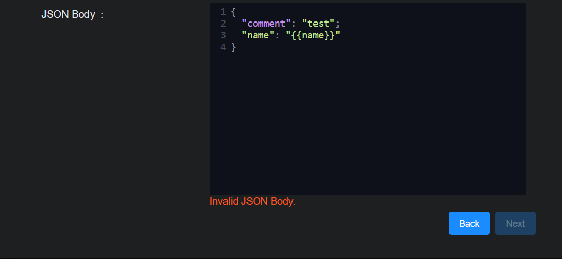 If the JSON format is incorrect, an error message, Invalid JSON Body, is displayed. In the following example, there is a semi-colon (;) instead of a comma (,) at the end of the "comment" line.