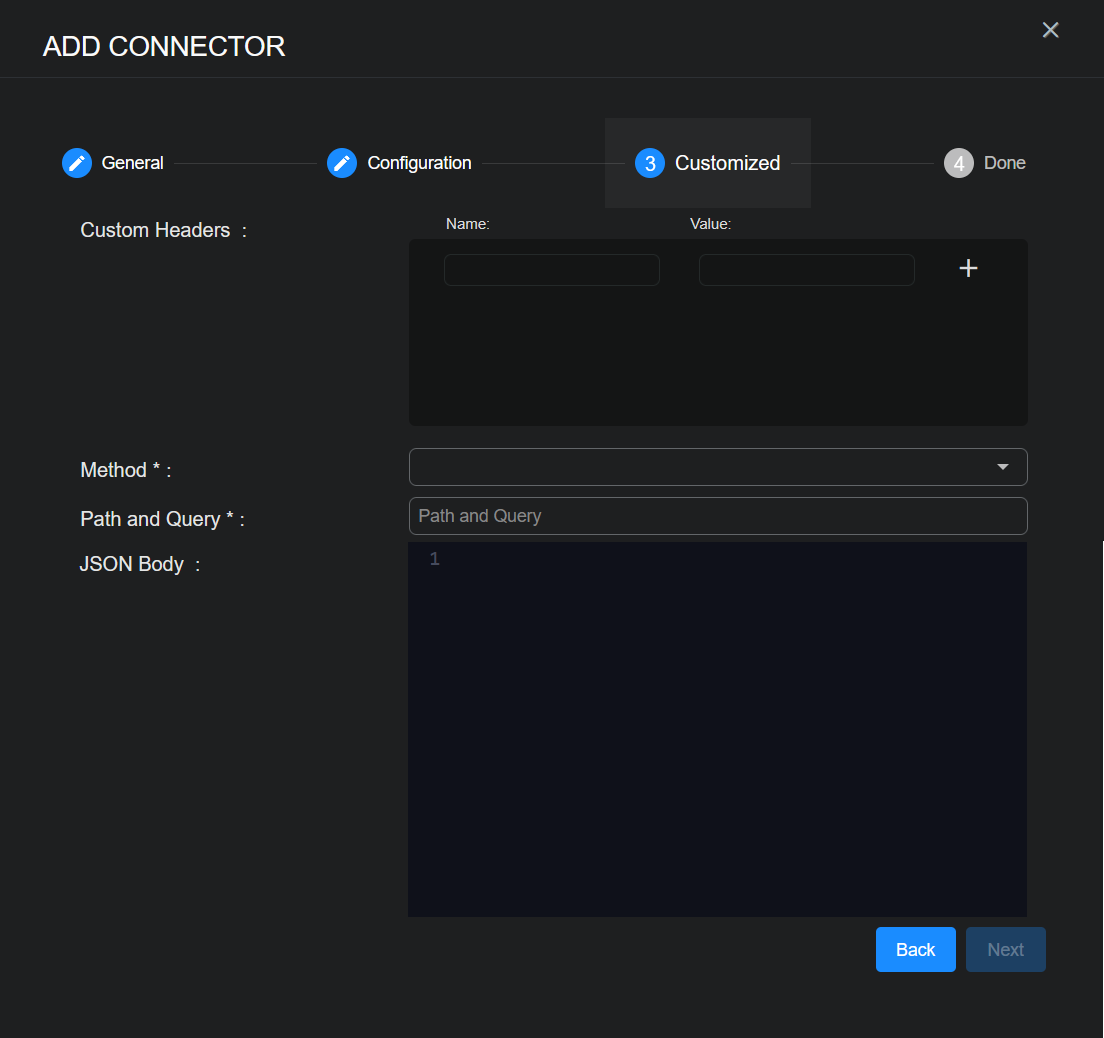 (Optional) Enter Custom Headers. Enter Name and Value. Click the button to add multiple pairs of Name and Value.