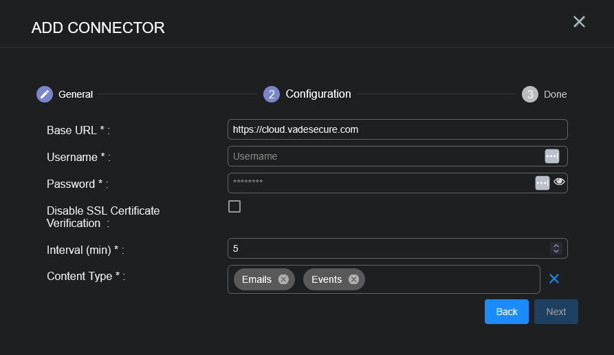 In addition to testing for connectivity, the Test button for the VadeSecure connector tests that the Base URL, Username, and Password are correct and data requests for the requested content types return successful responses.