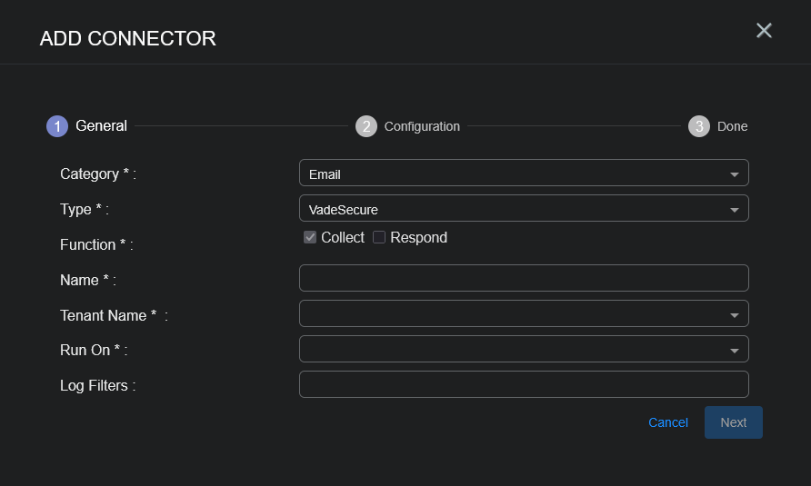 This connector allows Stellar Cyber to ingest logs from VadeSecure and add the records to the data lake. This connector integrates with the VadeSecure API to collect emails and events.