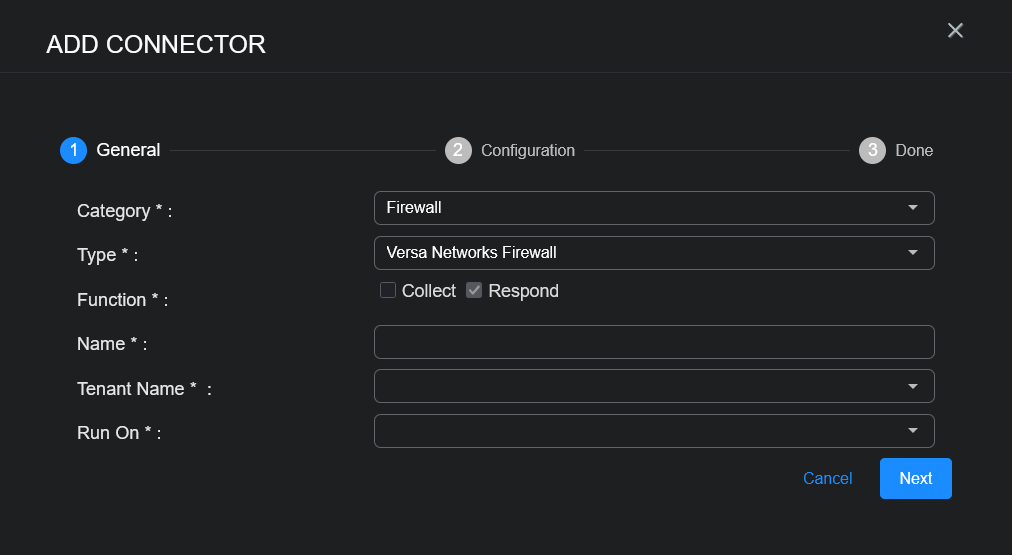 To add a new Versa Networks firewall connector in Stellar Cyber: