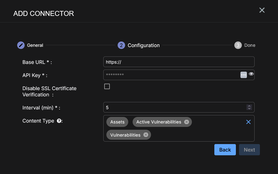 Choose the Content Type you would like to collect. The logs for Assets, Active Vulnerabilities, and Vulnerabilities are supported.