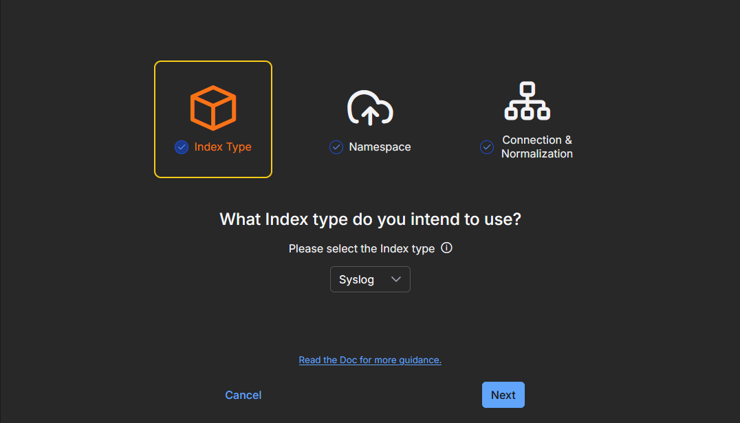 The first step for Index Type is already selected. Incoming data will be stored in the selected index. Select an Index type from the dropdown menu based on your data, such as AWS Events, Scans, Traffic, or Windows Events. The default is Syslog.