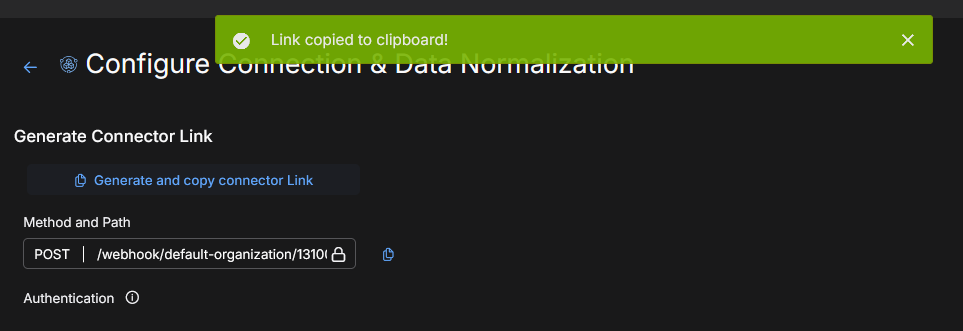In Generate Connector Link, click Generate and copy connector Link. The system will generate a unique webhook path/link. This is the endpoint where you will post data from third party systems to go into Stellar Cyber.