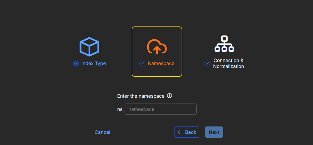 The configuration wizard opens. There are three main configuration steps: Index Type, Namespace, and Connection & Normalization.