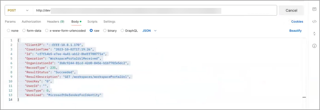To test data ingestion, post data to the saved webhook URL. For example, you can use Postman, or any other tool that generates HTTP requests, to forward the data to the endpoint.