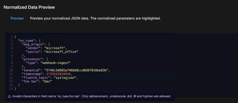 Use the Preview button in Normalized Data Preview to check the JSON syntax and validate the sample data.