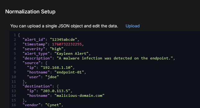 In Normalization Setup, click Upload to upload sample data from your source in a single JSON file.