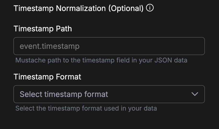 (Optional) Specify the Timestamp Path. Use this field to configure how timestamps are extracted and parsed from the incoming data. The timestamp path is a dot-notation path to the timestamp field in your JSON data, for example,