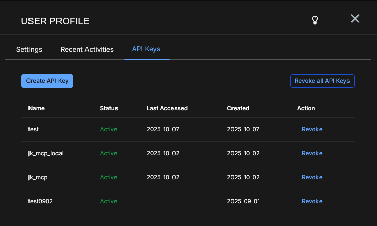For API keys, click your account name on the menu bar and select Profile. In the User Profile window, click the API Keys tab. See Editing Your User Profile.