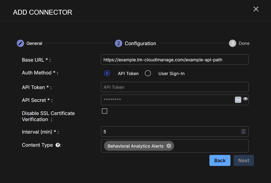 Stellar Cyber conducts a basic connectivity test for the connector and reports a success or failure result. A successful test indicates that you entered all of the connector information correctly.