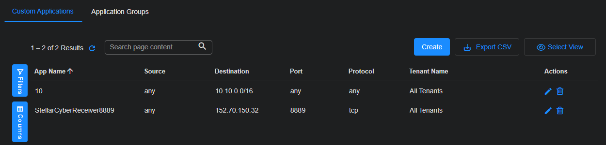 Select Create to add a filter (the Add Custom Application screen appears) or select the Edit icon to edit a row.