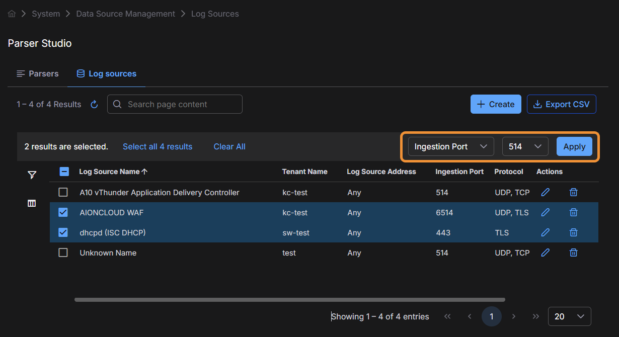 You can perform bulk edits of the ingestion port by selecting the checkboxes for multiple log sources and then using the Ingestion Port drop-down list and Apply button that appear at the top of the table.