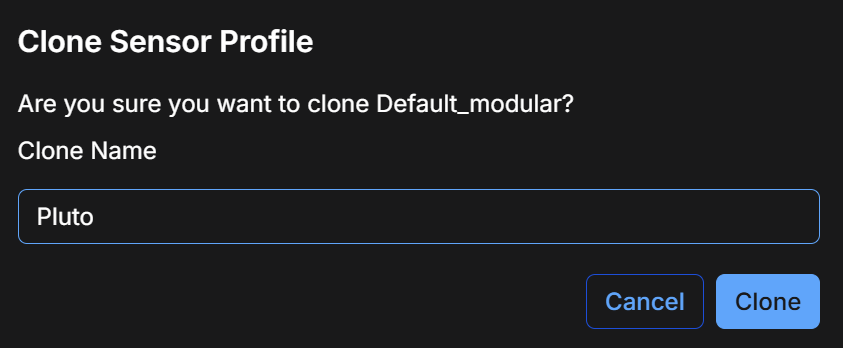 If you clone a single sensor profile, you can supply your own name for the cloned profile in the dialog box that appears. For example, in the illustration below, we've cloned the Default_modular sensor profile and given it the custom name of Pluto: