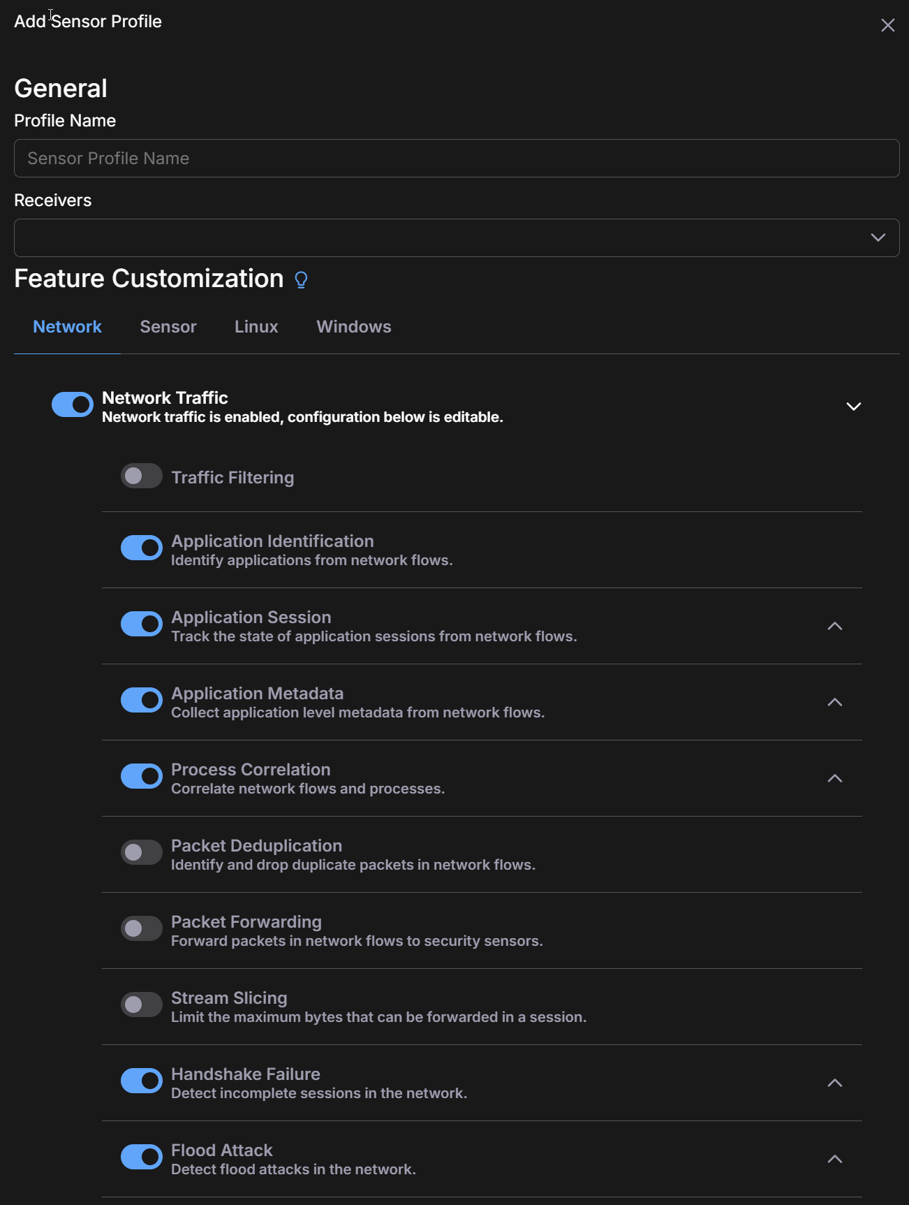 • Network Tab – Network traffic analysis settings for device sensors and Linux Server Sensors