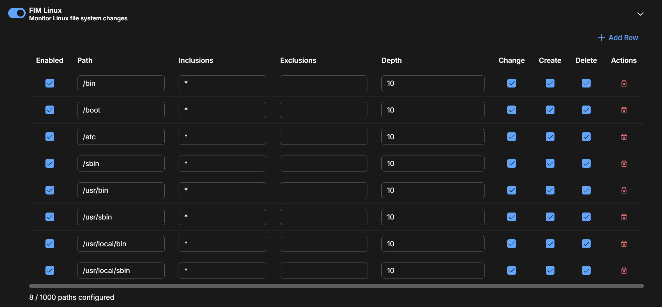 Select + Add Row to add new files and folders to the FIM feature. For each entry in the table, you can configure the following: