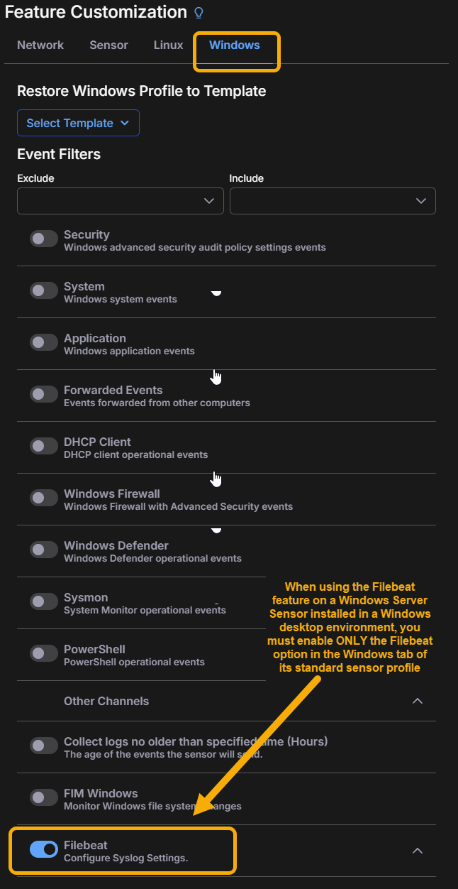 • When using the Filebeat feature on a Server Sensor installed on a Windows desktop, enable only the Filebeat option in the Windows tab in the Standard Sensor Profile. All other options must be disabled, as illustrated below:
