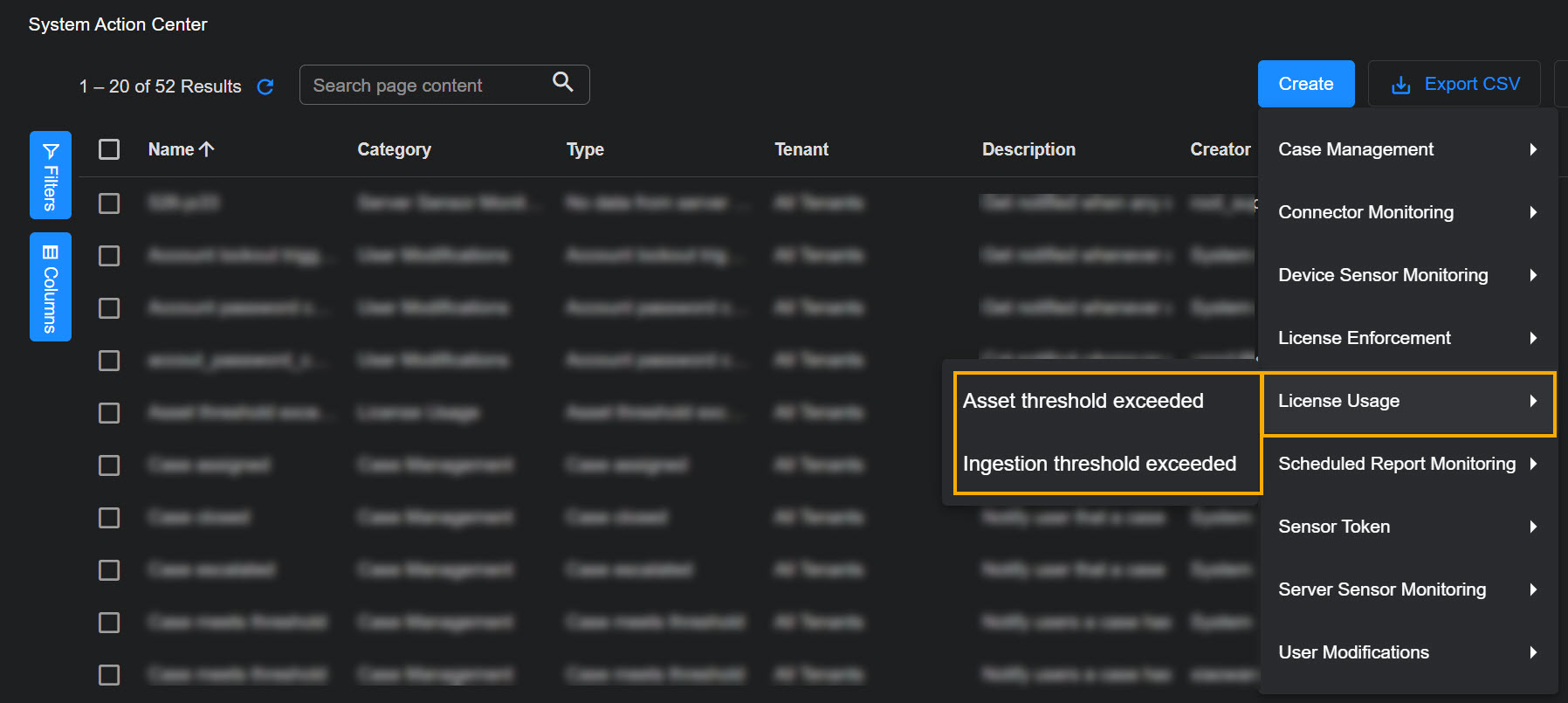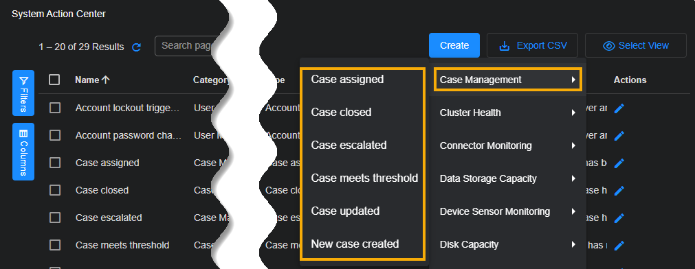 Click the Create button at the top of the System Action Center and select Scheduled Report Monitoring | Scheduled report failed from the dropdown that appears.